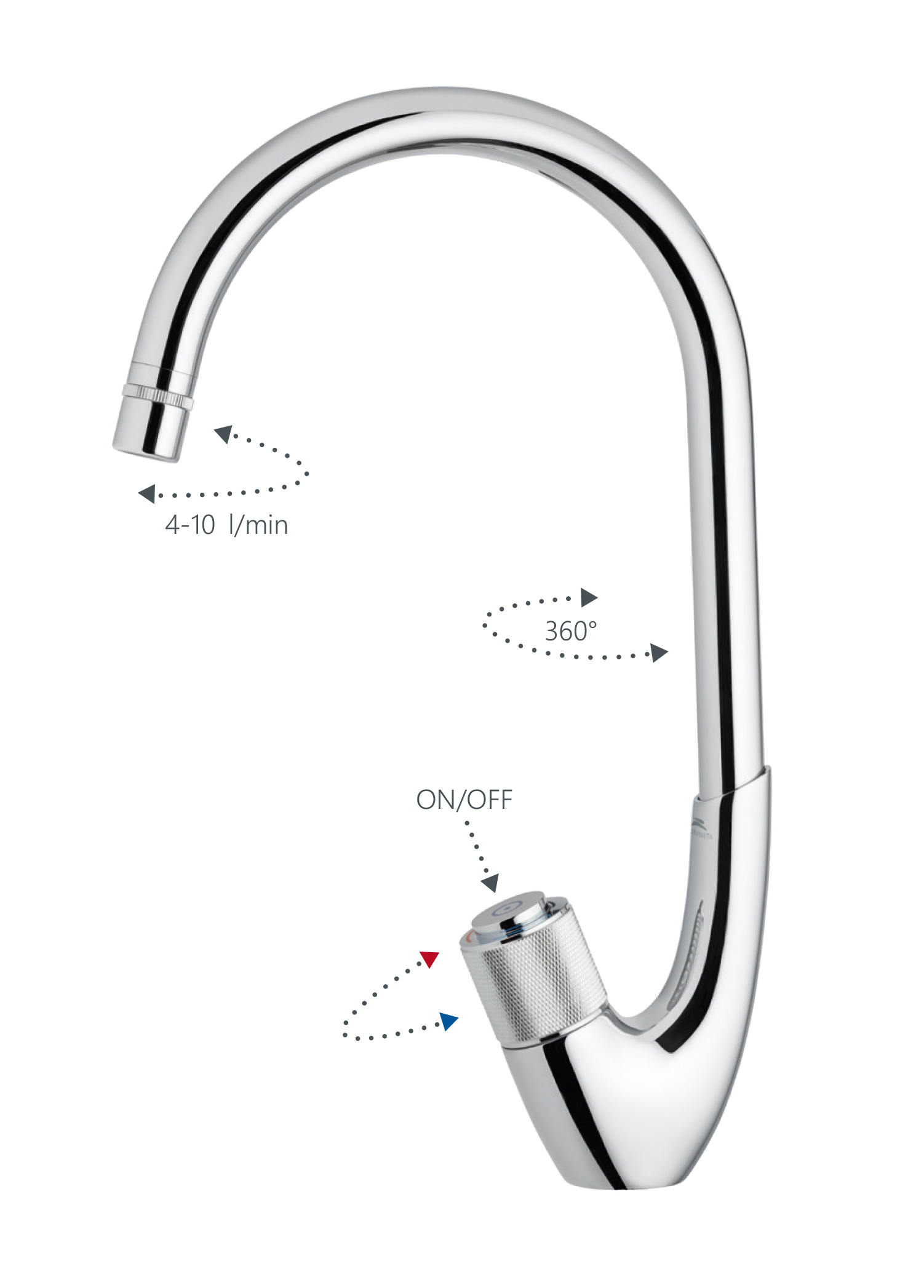 Jaucējkrāna snīpi varat pagriezt 360°.